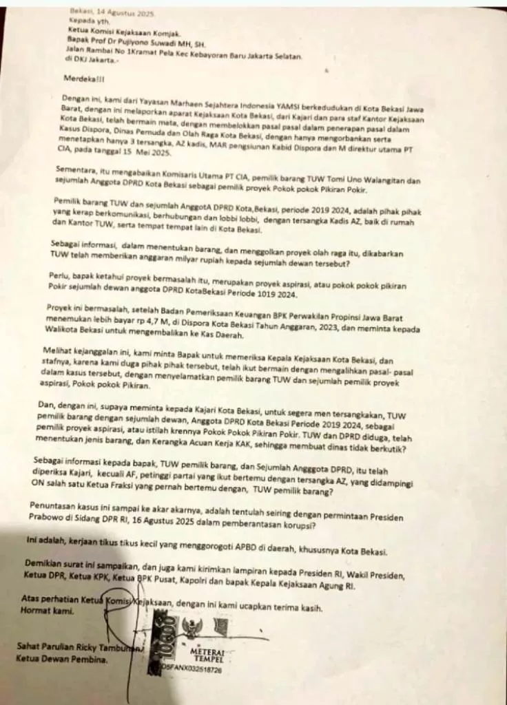 KOTA BEKASI – Yayasan Marhaen Sejahtera Indonesia (YAMSI) melaporkan Kejaksaan Negeri Kota Bekasi ke Komisi Kejaksaan (KOMJAK) terkait penanganan kasus dugaan korupsi pengadaan alat olahraga di Dinas Pemuda dan Olahraga (Dispora) Kota Bekasi.
